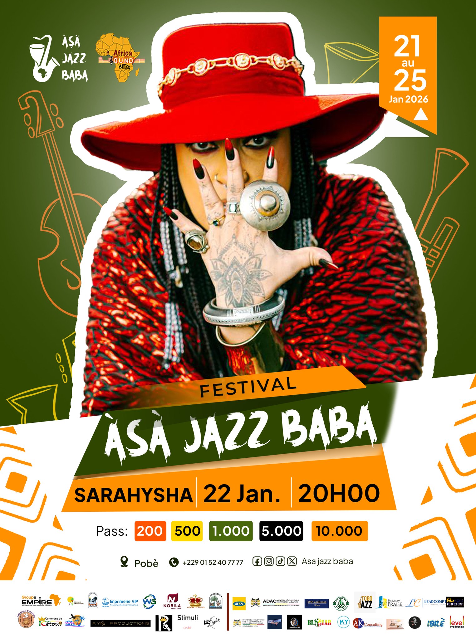 Le festival Asa Jazz Baba International, qui se déroulera du 21 au 25 janvier 2026 dans le département du Plateau au Bénin, accueille Sarahysha pour une performance unique le 22 janvier à 20h à Pobè. Artiste brésilienne installée au Bénin, Sarahysha est une figure marquante de la scène musicale contemporaine. Chorégraphe, compositrice et interprète, elle a fondé The Spiritual Biatch !, un laboratoire de recherche dédié à la musique, à l’audiovisuel et à la performance, explorant les rythmes traditionnels du Bénin, l’afro-jazz brésilien et la musique binaurale.